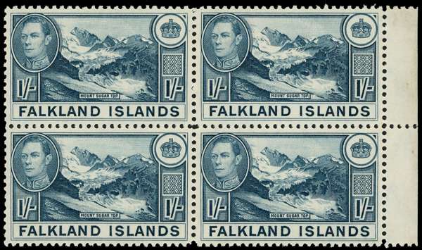 1938 printing of 1/- dull greenish blue right marginal block of four, unmounted o.g. SG 158a, £240