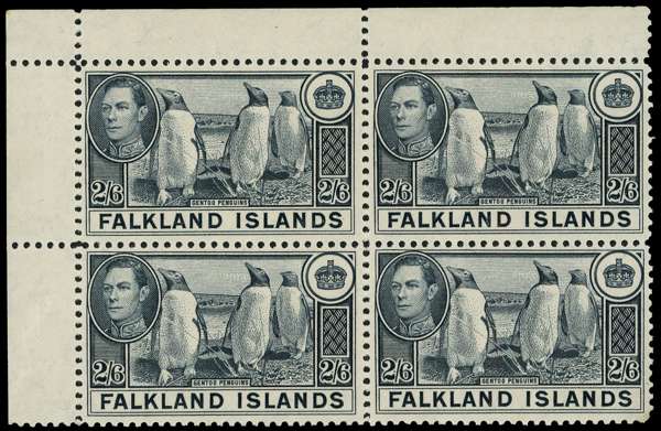 1944 printing of the 2/6d in yellowish slate top left corner block of four, unmounted o.g. SG 160, £260