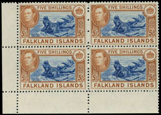 1938 5/- blue and chestnut lower left corner block of four, hinged on the top pair with the lower pair unmounted o.g. SG 161, £640