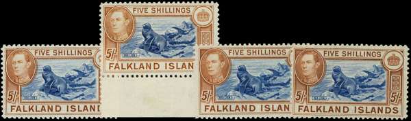 1938-50 5/- the four printings, fine lightly hinged o.g. The ‘indigo’ lower marginal and especially nice. SG 161, b-d, £1815