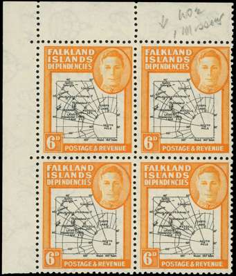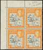 1946 Thick Map 6d black and orange corner block of four, unmounted o.g. R1/2 missing ‘I’. SG G6b, £250