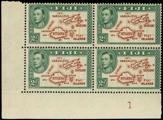 1938 2d brown and green Die I lower left corner block of four, R10/2 extra line, unmounted o.g. (good gum for this). R9-10/1 with an unobtrusive internal wrinkle, still fine ad a scarce multiple. SG 253, a, £1120