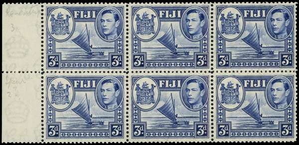 1938-55 3d blue marginal block of six, R4/2 spur in medallion and 3/3 top right corner re-entry, unmounted o.g. SG 257a, £750