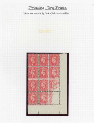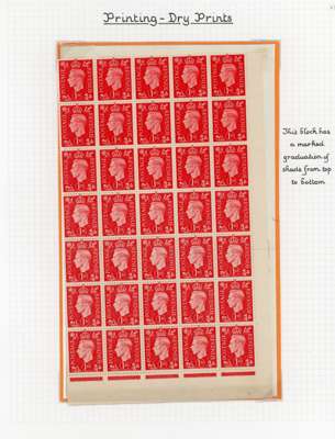 1941 1d pale scarlet lower right corner block of twelve displaying a good dry print, showing two stamps partially blank, o.g., hinged on the top left stamp only. Also a block of thirty-five 1937 1d scarlet unmounted o.g. from the lower right corner showing a progressive dry print, resulting in a change of shade and printing quality towards the bottom of the sheet; quite striking. SG 463, 486 var