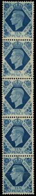 1939-52 10d turquoise-blue vertical strip of five with a dry print affecting all five stamps to a greater or lesser degree, o.g. with three unmounted. SG 474