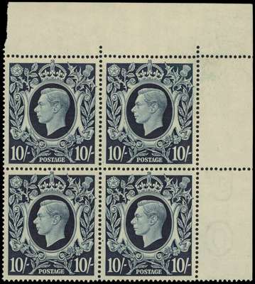 1939 10/- dark blue corner block of four with R2/7 retouch to lower lip unmounted o.g., R1/8 with a touch of printing ink on the reverse otherwise fine. SG 478, Q32e
