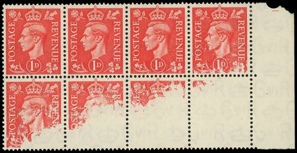 1941 1d pale scarlet right marginal block of eight, o.g., hinged on the top right stamp only. Shows a very strong dry print, mostly affecting the lower row, with the bottom right stamp almost blank. SG 486 var