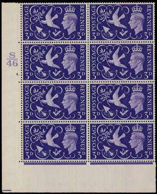 1946 3d Victory Cylinder 4 dot block of eight, Perforation Type 5. Unmounted o.g., gum slightly two-toned; fine appearance and rare. SG 492, Spec Q13, £350