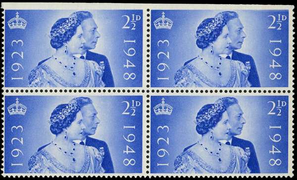 1948 2½d Silver Wedding block of four, unmounted o.g. An apparent perf jump at top has been cut down to give the appearance of ‘imperforate between stamp and margin’; still an uncommon item. SG 493 var