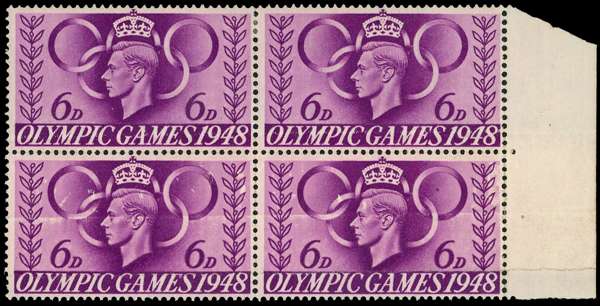 1948 6d Olympics marginal block of four, with paper join giving double thickness paper, large part o.g. Gum slightly two-toned, an unusual variety on this issue. SG 497 var