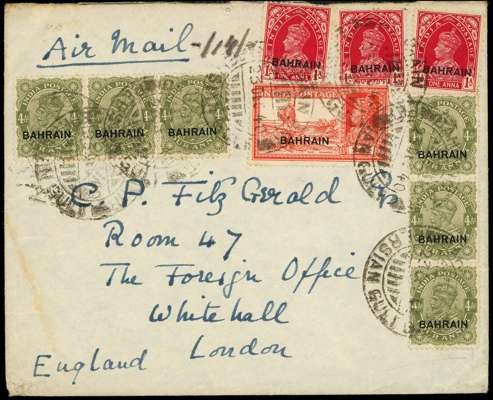 Postal History. 1940 air mail envelope from Bahrain franked with KGV 4a (6), KGVI 1a (3) and 2a with 23 DE CDSs. Addressed to Room 47, The Foreign Office, the backflap indicating the sender as the wife of Commodore Graham. Ex John Daynes