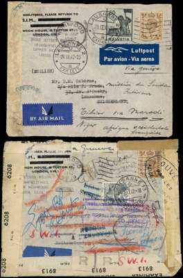 Postal History. 1942 two covers to Switzerland each with 5d brown, the first readdressed to Niger with added Swiss 80c, the other returned to sender, both censored; and 1941 cover to Yugoslavia with Egyptian censor tape and marking, with violet ‘Return to Sender’, boxed NO SERVICE/ RETURN TO SENDER and boxed DAMAGED BY SEA WATER. Some faults, but three well-travelled covers with many markings