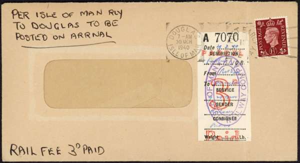 1940 window envelope with 1½d tied by Douglas slogan cancel, 3d Railway stamp added with oval violet ISLE OF MAN RAILWAY COMPANY cancels. One of two covers recorded