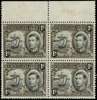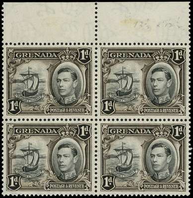 1940-50 1d perf 13½ x 12½ upper marginal block of four, R1/6 extra window and broken handrail. Hinged on the front of the selvedge only. SG 154bb, £300