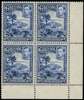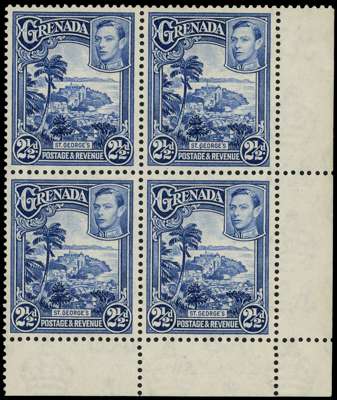 1950 2½d bright blue, perf 12½ x 13½. Unmounted o.g. lower right corner block of four, an unnumbered Plate block; extraordinarily rare, absent from the Royal Collection. A showpiece of any Grenada or KG VI collection. SG 157a, £44000