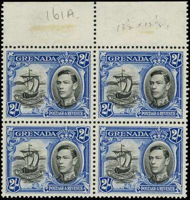 1941-50 2/- perf 13½ x 12½ upper marginal block of four, R1/6 extra window and broken handrail, hinged on the front of the selvedge only. Rare multiple. SG 161ab, £1100