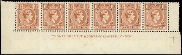 1944 1½d light red-brown imprint strip of six (splitting along central fold), o.g. hinged on two only, the fourth stamp with a foxed perf. A very rare multiple, with BPA Certificate (1952). SG 123 var, CW 5b (retail £1200 for hinged)
