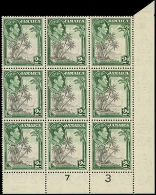 1939-51 2d grey and green perf 13 x 13½ unmounted o.g. Plate 7-3 block of nine, unmounted o.g., showing ‘C’ of CA in watermark omitted, in the selvedge below R6/10 ( the ‘A’ twisted). Visible through the front of the selvedge. Ex Baillie. SG 126 (SG 126a when on the stamp, £1500)