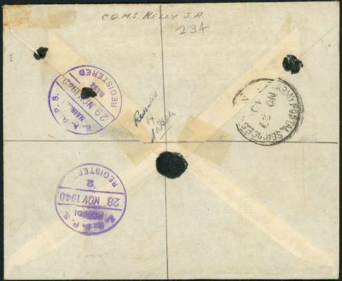 1940 registered envelope to Salisbury with 15c (2) cancelled by violet E.A.A.P.S./ NAIROBI/ BASE/ REGISTERED CDS of 29 NOV with further strikes (28 & 29 Nov) on reverse, one being the very rare mark with ‘2’ in place of ‘BASE’, only in use for four weeks. Army Postal Services registration mark on front, also boxed Censor and franking mark; some creasing and light staining, but a rare cover, ex John Daynes