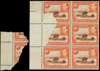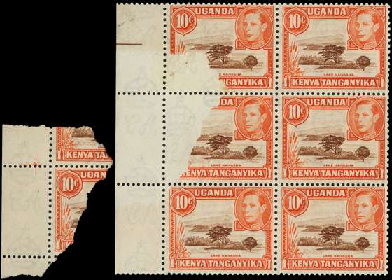 1938-49 10c red-brown and orange marginal block of six, printed on partially doubled paper, which has separated, giving a spectacular ‘missing printing’ variety. Unusual. SG 134 var