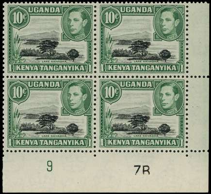 1949 10c black and green perf 13 x 11¾ Plate 9-7B block of four, showing frame printed double, one albino. Visible from the front on the lower selvedge, a unique multiple, unmounted o.g. SG 135c, £4800