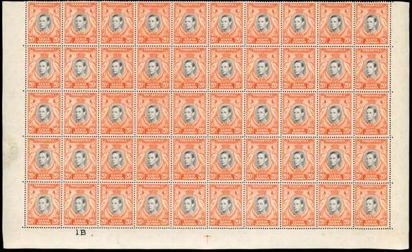 1938 20c black and orange perf 13¼, bottom half-sheet of fifty, unmounted o.g. Large Vignette Plate number 1B under R10/2; an unusual multiple. SG 139, £2250