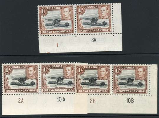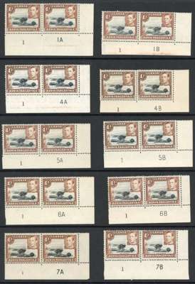 1938-54 1/- thirteen Plate number pairs with different numbers, mint, mixed hinged and unmounted. 1-1A and 1-1B (these in the original shades, the latter of fine appearance with a strip of paper stuck to the reverse of the selvedge), 1-4A and 4B, 1-5A and 5B, 1-6A and 6B (6B stained on one stamp), 1-7B, all these perf 13 x 11¾; perf 13 x 12½ 1-7A, and clearer impression 1-8A, 2A-10A, 2B-10B. Mostly good with the odd short perf noted, SG 145-ba