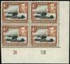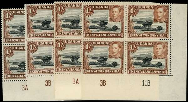 1950-4 1/- last printings perf 13 x 12½ (clearer impression). Four unmounted o.g. Plate blocks numbered 3A-10A, 3B-10B, 3A-11A and 3B-11B. The latter two numbers appeared too late for inclusion in Berrington's book, and show the frames in a notably rich chestnut shade. SG 145ba, £768
