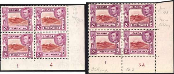 1941 2/- perf 14 and 1944-54 2/- perf 13¾ x 13¼ Plate blocks, each unmounted o.g. with contemporary dates pencilled on the selvedge. The perf 14 block Plate 1-3A, ‘Jan 43 From Colony’; perf 13¾ x 13¼ ‘C.A. N.P 10/7/52’. SG 146a, b, £540