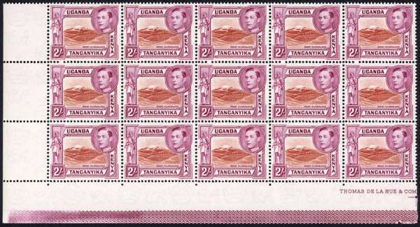1944-54 2/- perf 13¾ x 13¼ corner block of fifteen with part imprint, unmounted o.g., showing fine lathework on lower selvedge. SG 146b, £750