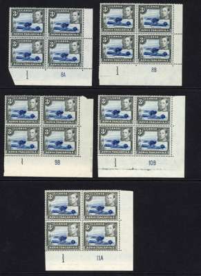 1950 3/- perf 13 x 12½ Plate blocks; 1-8A, 1-8B, 1-9B, 1-10B and 1-11A. All unmounted o.g. save 1-9B, lightly hinged on the top pair only. SG 147ac, £1100