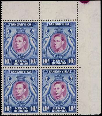 1938 10/- purple and blue, perf 13¼ top right corner block of four, very fresh for this. A most uncommon multiple, ex Libra. SG 149, £760