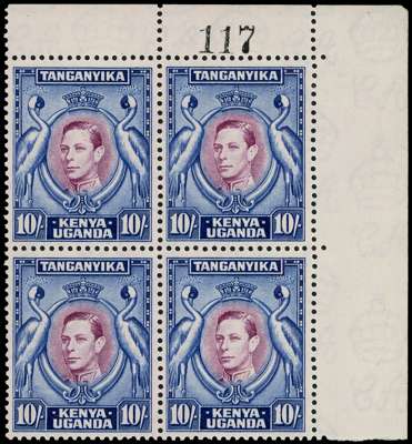 1938-41 10/- lake and blue perf 13¼, the second printing without streaky gum. Top right corner block of four with sheet number, a rare multiple, fresh unmounted o.g. Ex Libra. SG 149 var