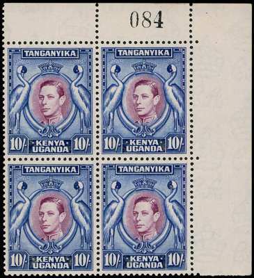 1938-41 10/- lake and blue perf 13¼, the second printing without streaky gum. Top right corner block of four with sheet number, a rare multiple, fresh unmounted o.g. SG 149 var