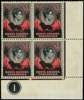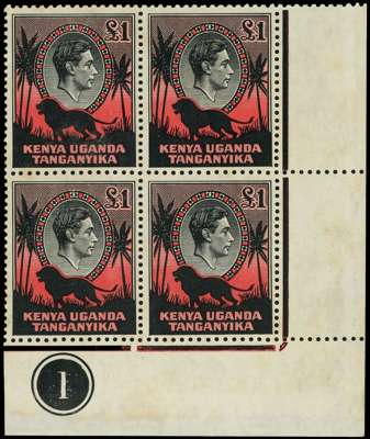 1938 £1 black and red, perf 11¾ x 13, Plate block of four from the lower right corner. The block with some light staining, o.g., possibly unmounted, with some gum disturbance on the upper pair. A very rare Plate block. SG 150, £2200