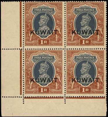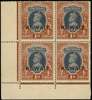 1939 1r grey and red-brown corner block of four, unmounted o.g., with quite light even toning. R3/2 LLP extended ‘T’. The lower pair with natural gum bends. SG 47a, £1100