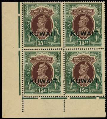 1939 15r brown and green, watermark inverted. Lower left corner block of four, R3/2 LLP second repair to extended ‘T’. Unmounted creamy o.g. Natural gum bends affect the three normal stamps. A very rare block, ex Donaldson; BPA Certificate (1978). SG 51wa var