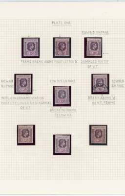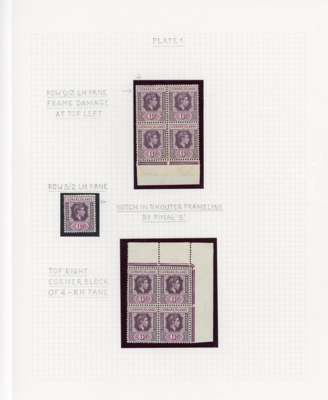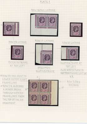 1938 6d Plate 1 study on four pages. Includes Specimen R1/1 corner example unmounted, with the sloping frame variety; unmounted Plate no. pair; unmounted blocks of 6, 4 (3) and 3; pairs (2); mint singles (15) and used singles (2), mostly with varieties. A fine group, ex Harold Green. SG 109, £1470+