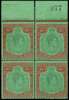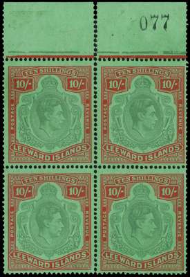 1942 (Mar.) 10/- pale green and dull red on green paper top marginal block of four with sheet number 077, HPFs #11, the major 12a, 12c and 23. The block is very fragile and may separate into two vertical pairs at any time. A rare multiple, ex Stuart Stokes. SG 113a, £3400