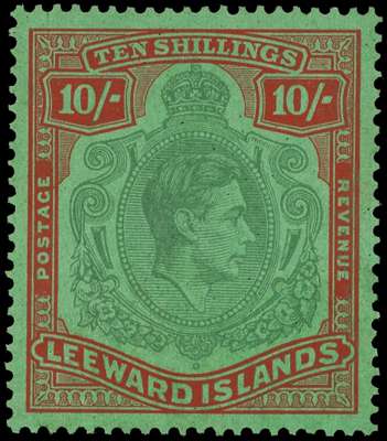 1942 (Mar.) 10/- pale green and dull red on green paper, large part o.g. SG 113a, £850