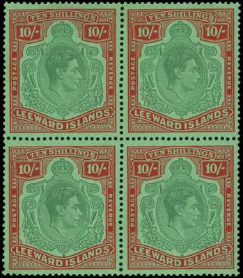 1943 (Dec.) 10/- green and red on green paper block of four, o.g., hinged on upper left stamp only. Top right stamp shows the rare FF #44 ‘damaged cliché’, a pronounced state. Scarce, ex Stuart Stokes. SG 113b, CW 12bH