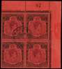 The sheet number is an anomaly. Sheets from the original printing (43 sent to the colony) were unnumbered; those from the second printing (39 sheets) were numbered but from 1 upwards. It seems to be a fair assumption that this block came from a sheet included with the despatch of the third printing, of which 100 numbered sheets were sent to the colony. The postmark date (although very early for the third printing) seems to support this supposition