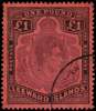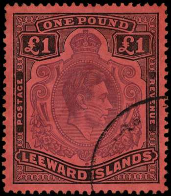 1942 (Feb.) £1 deep purple and black on carmine-red paper, used example with HPF #17 gash in chin, the CDS rather indeterminate. SG 114af, £1300