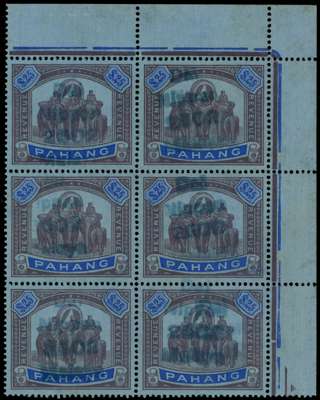Revenues. 1942 Pahang $25 purple and blue on blue paper top right corner block of six, each handstamped DAI NIPPON 2602 MALAYA in blue, large part o.g. with five stamps unmounted. A wonderful multiple, BPA Certificate (2020)