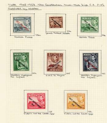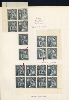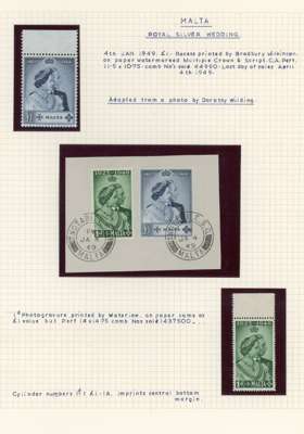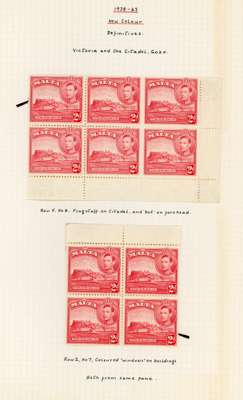 1943 1½d slate-black corner block of eight with R5/7 broken cross, and 2d scarlet corner block of six with R5/8 flag on citadel, each large part o.g. Also 2d scarlet marginal block of four with R2/7 extra windows, hinged on selvedge only, 1948 New Constitution set mint and used, and Wedding pair unmounted o.g. and fine used. SG 220ba/250