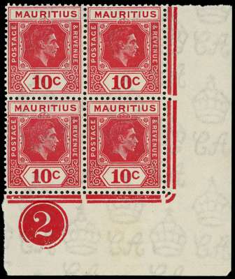 1943 10c deep reddish rose lower right corner block of four with Plate 2, R10/5 serrated edge, Fine unmounted o.g. SG 256cb, £250