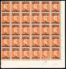 Spanish Currency. 1951 5c on ½d pale orange unmounted o.g. corner block of thirty, R20/11 showing a ‘ghost’ impression of the surcharged value. Annotated ‘Cyl 155’ in pencil on selvedge. Visually a very striking piece. SG 182