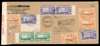 1942 Southern Pacific envelope (9½ x 4") to California franked with France Libre 5c pair, 10c and 15c (pair and two singles of each), paying double rate. Port Vila CDSs of 23 JUL and registration handstamp with fine censor on reverse. Sydney censor mark, resealing tape and handstamps. Scarce. SG F65-7