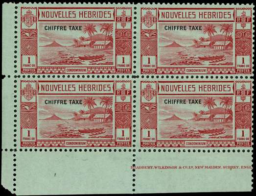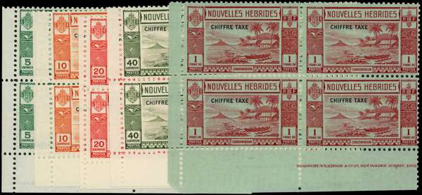 Postage Dues. 1938 set in lower left corner blocks of four with part imprint, unmounted o.g., unusually fine with no toning. SG FD65-9, £600