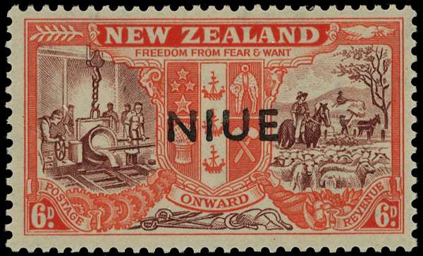 1946 Victory 6d chocolate and vermilion with overprint double, one albino, unmounted o.g. RPSNZ Certificate (1988). SG 100a, £550
